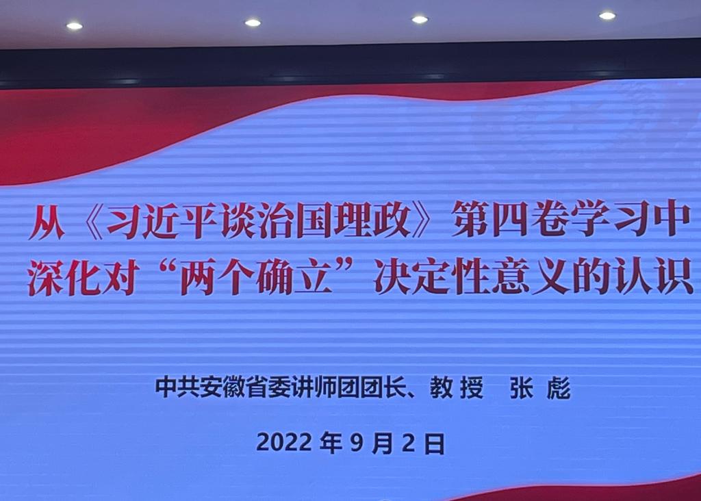 为贯彻落实习近平总书记在省部级主要领导干部专题研讨班上重要讲话精神,全省开展“举旗帜·送理论”省级示范宣讲活动。淮北市委宣传部邀请了中共安徽省委讲师团团长张彪教授于9月2日上午9时在市公安局报告厅作宣讲报告,张团长宣讲的主题为:从《习近平谈治国理政》第四卷学习中深化对“两个确立”决定性意义的认识。太阳成集团tyc7111cc刘奔前和孙澄澄老师作为入选的淮北市宣讲团成员,代表公司参加会议。